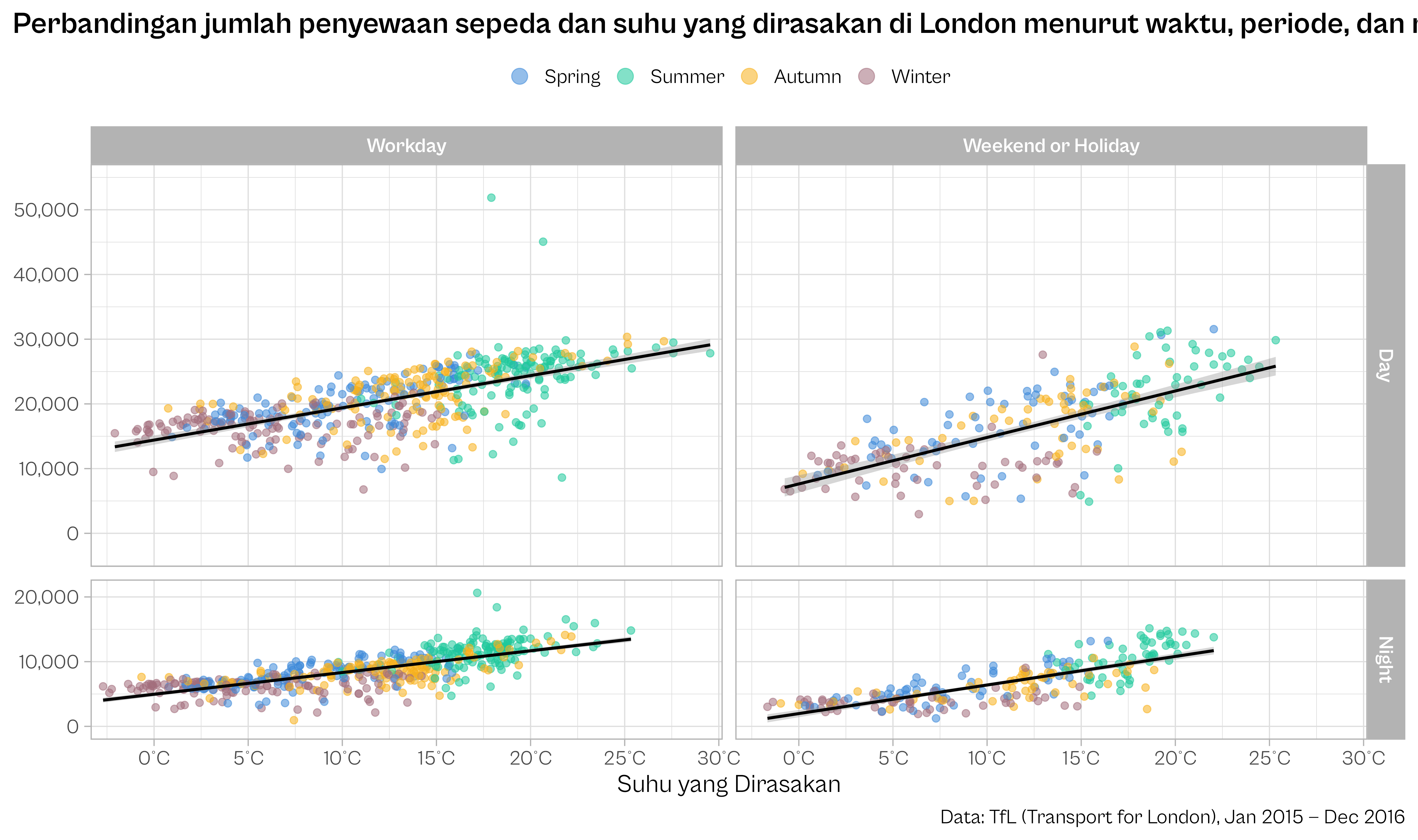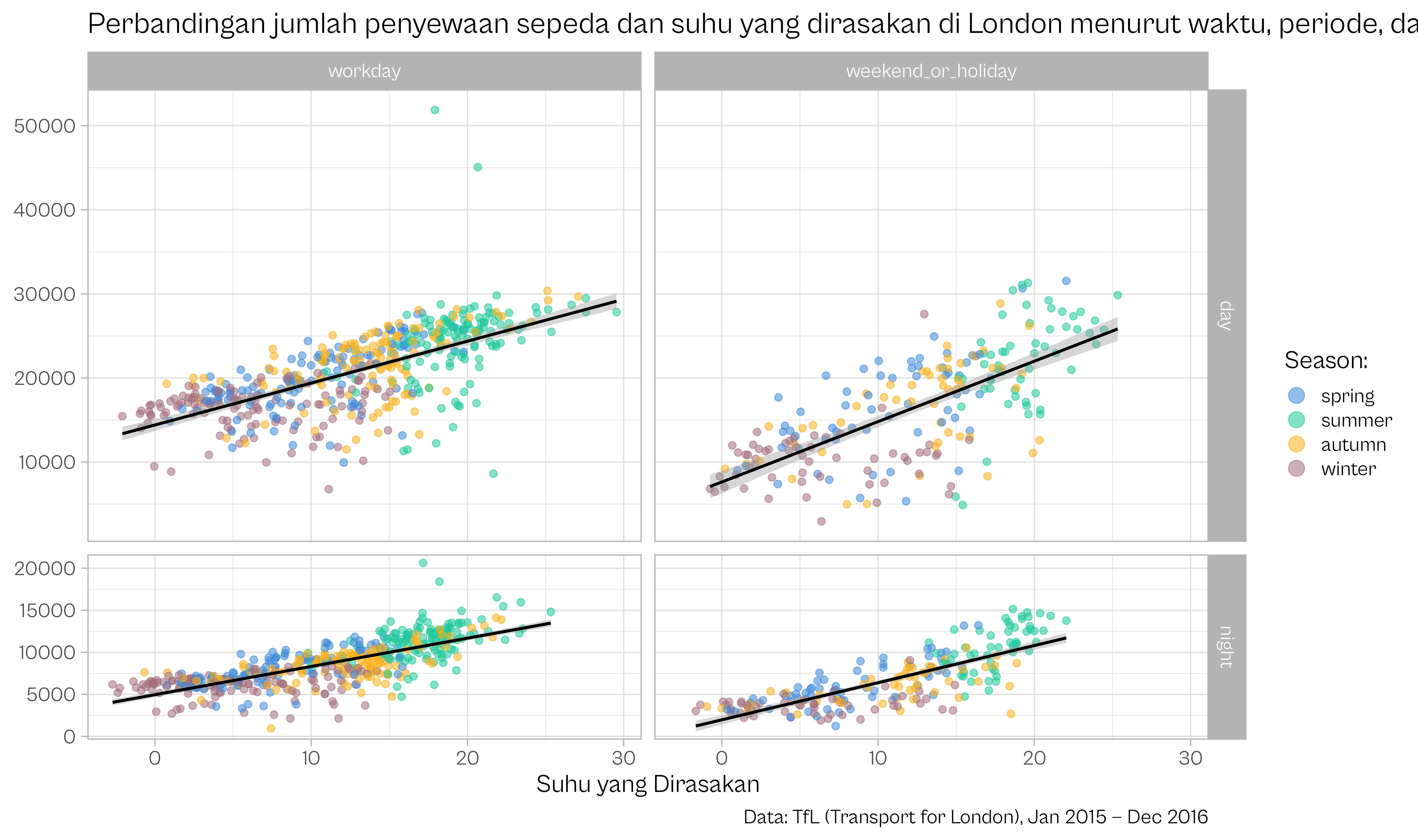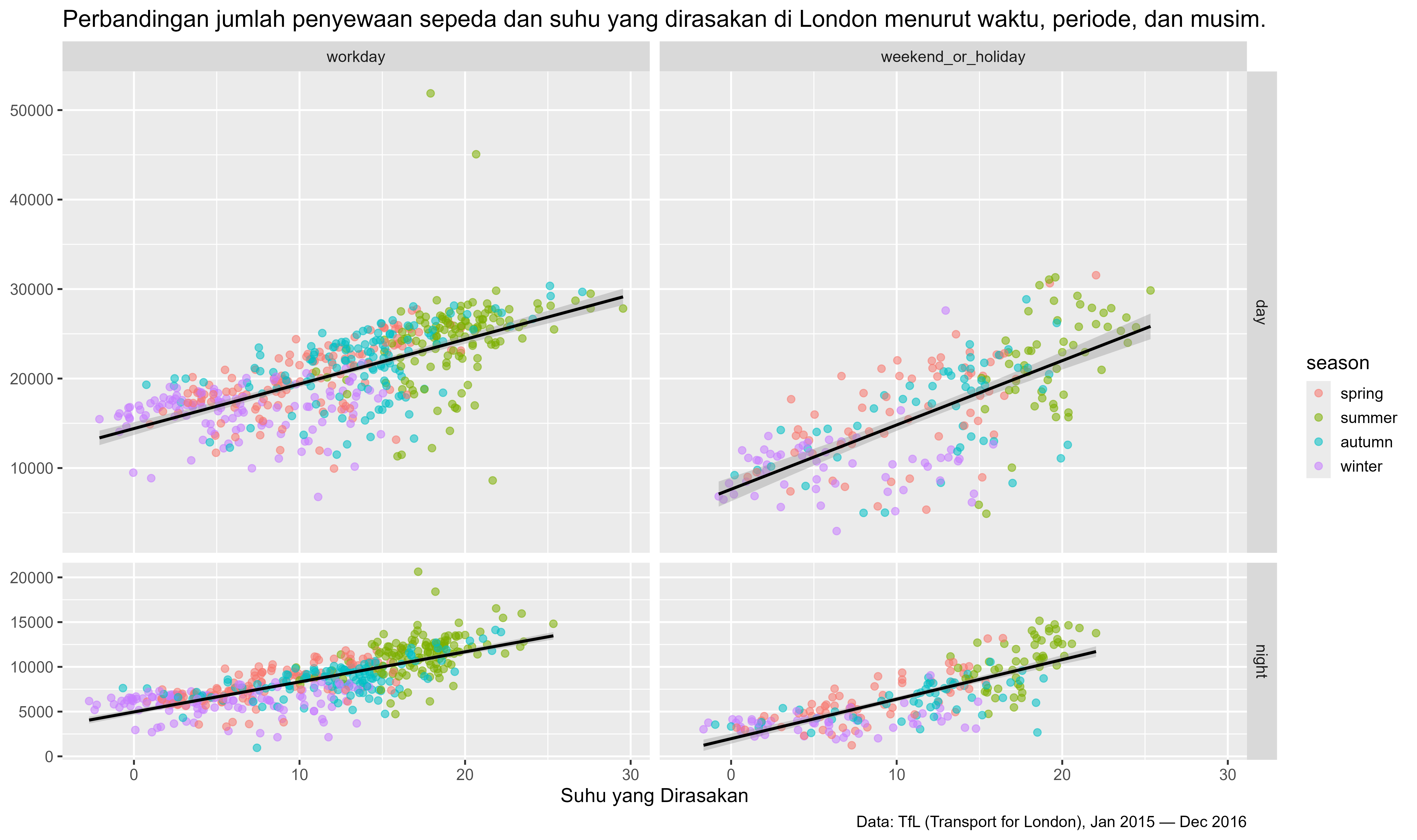 title = "Perbandingan jumlah penyewaan sepeda dan suhu yang dirasakan di London menurut waktu, periode, dan musim."