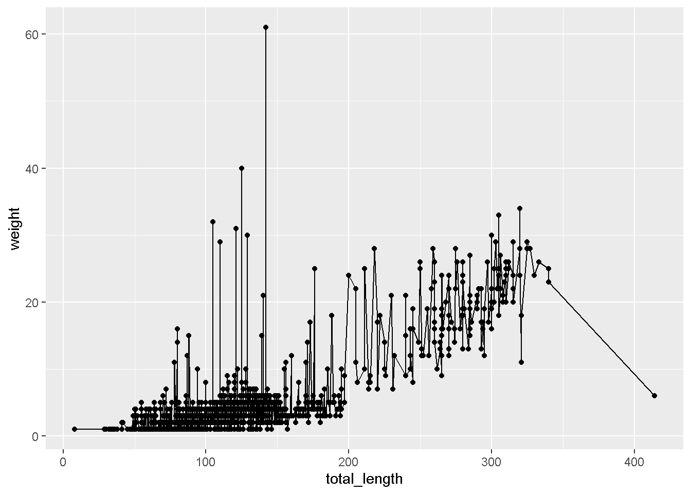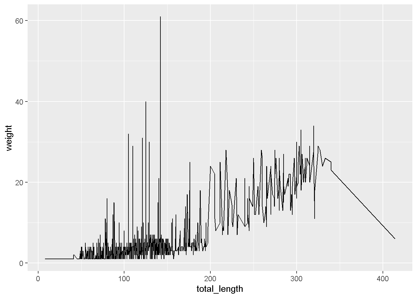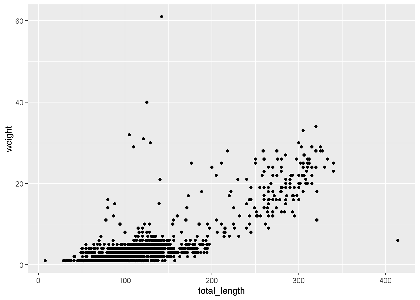 ggplot(data = lizards, aes(x = total_length, y = weight)) +