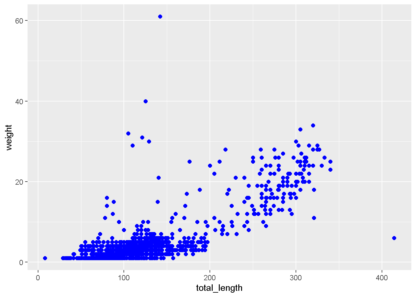 Hasilnya adalah grafik yang menampilkan hubungan antara panjang total (total_length) dan berat (weight) kadal dalam bentuk titik-titik.