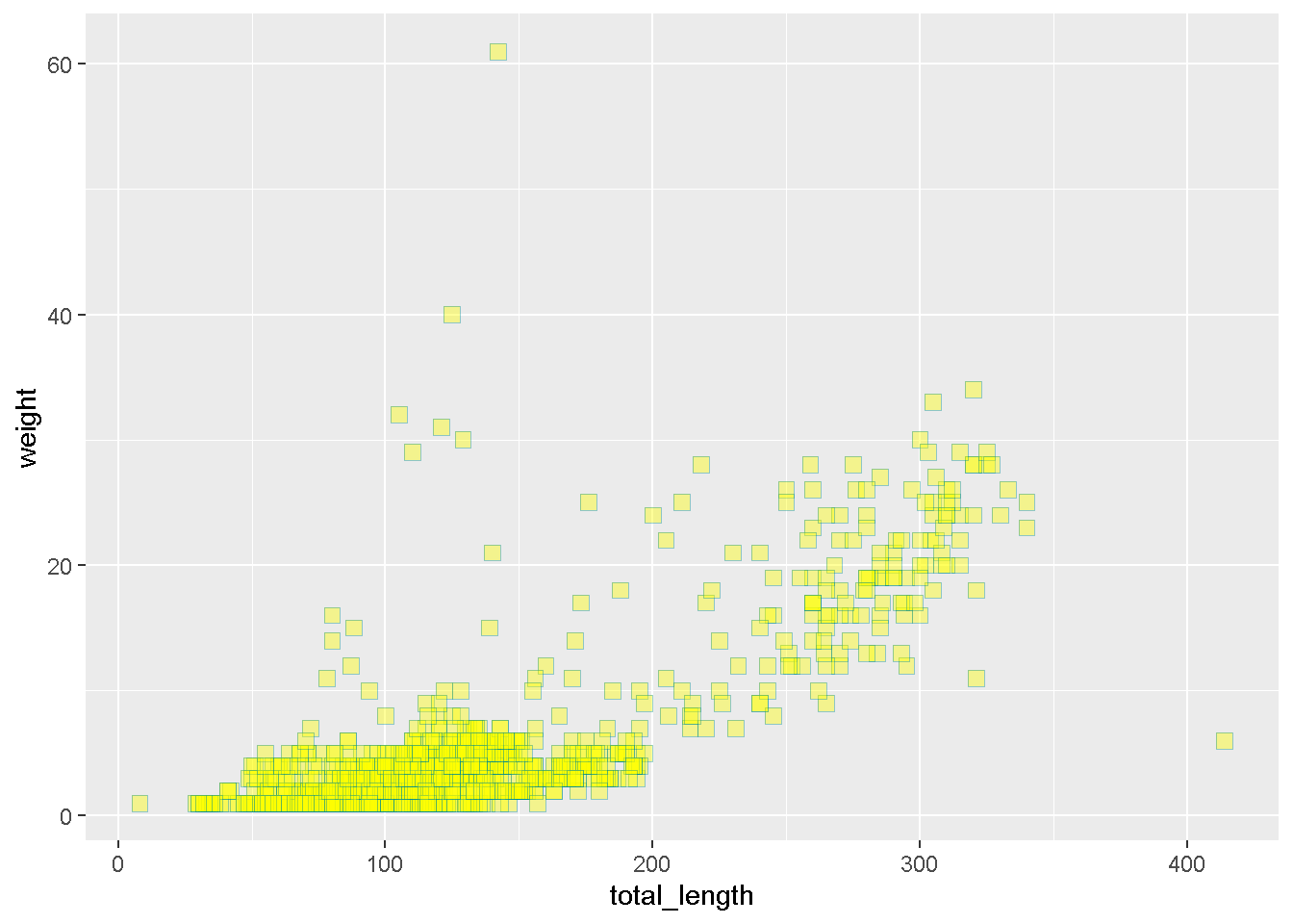 plot_base <- ggplot(data = lizards, aes(x = total_length, y = weight))