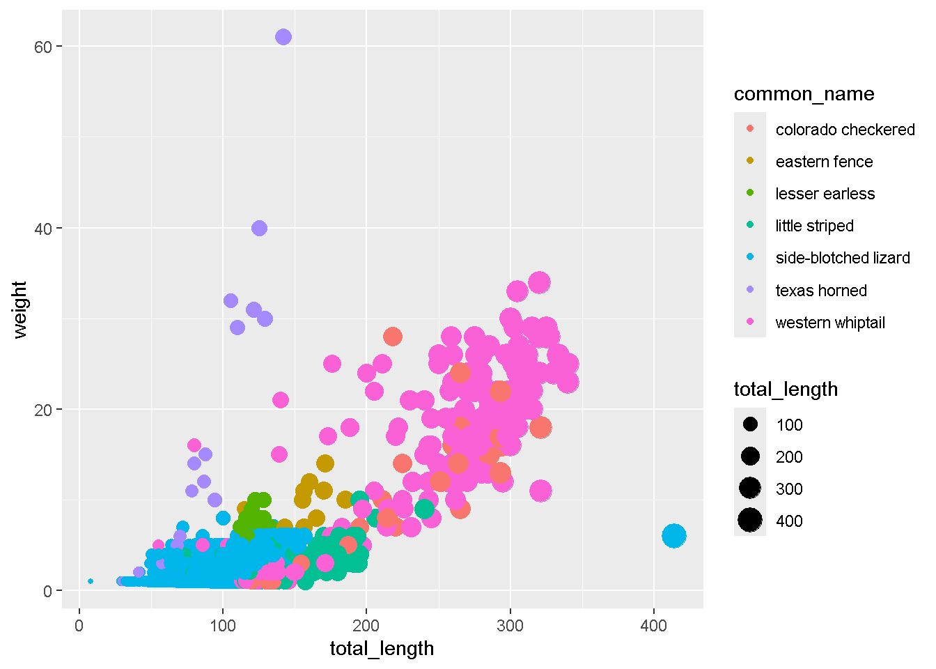 - Kadal dengan panjang total lebih besar akan ditampilkan sebagai titik yang lebih besar.